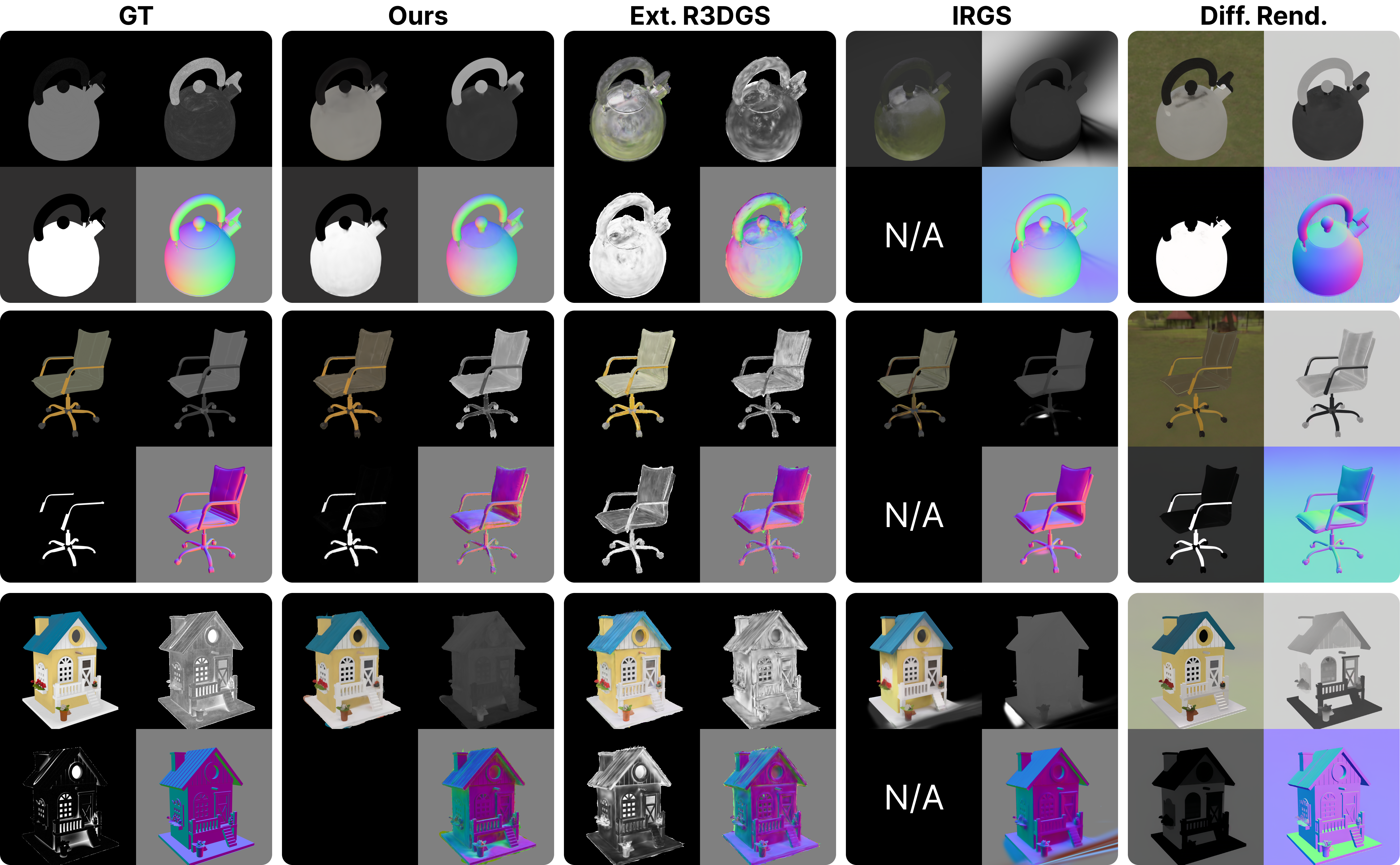 Relighting Quality — Our method produces relighting results that closely match ground truth, particularly for specular objects. Unlike R3DGS which struggles with unconstrained material optimization, MatSpray constrains materials through the Neural Merger, enabling more accurate environment map optimization. IRGS exhibits artifacts such as floaters and overly flat surfaces, while our approach maintains geometric detail and accurate material properties across both diffuse and specular surfaces.