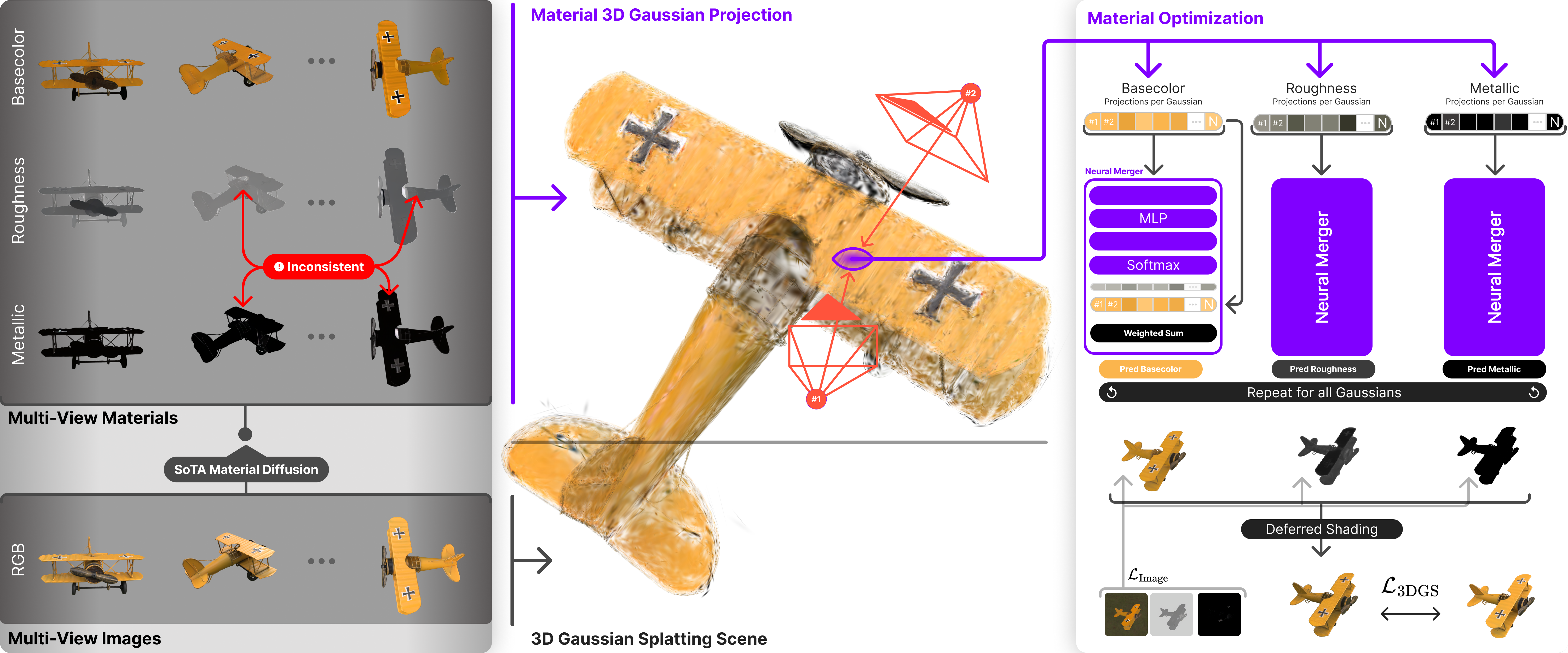 MatSpray combines 2D diffusion predictions with 3D Gaussian geometry to recover consistent, relightable PBR materials. Our pipeline begins by generating per-view material maps using any diffusion-based material predictor (we use DiffusionRenderer in our experiments). The scene geometry is reconstructed via relightable Gaussian Splatting, providing both geometry and normals. The 2D material estimates are then transferred to 3D using Gaussian ray tracing, which projects material values from pixels to Gaussians based on their projected footprints. To resolve multi-view inconsistencies inherent in 2D predictions, we introduce the Neural Merger—a lightweight MLP with softmax output that aggregates per-view material estimates per Gaussian. The merged materials are refined through dual supervision: material maps are supervised against the 2D diffusion predictions, while deferred PBR rendering is supervised against ground-truth images with an optimizable environment map.